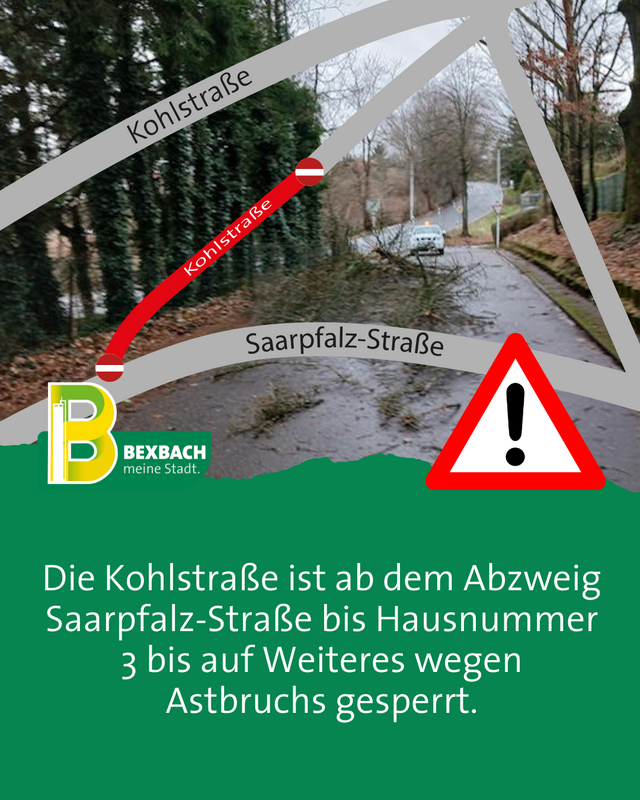 Die Kohlstraße ist ab dem Abzweig Saarpfalz-Straße bis Hausnummer 3 bis auf Weiteres wegen Astbruchs gesperrt.